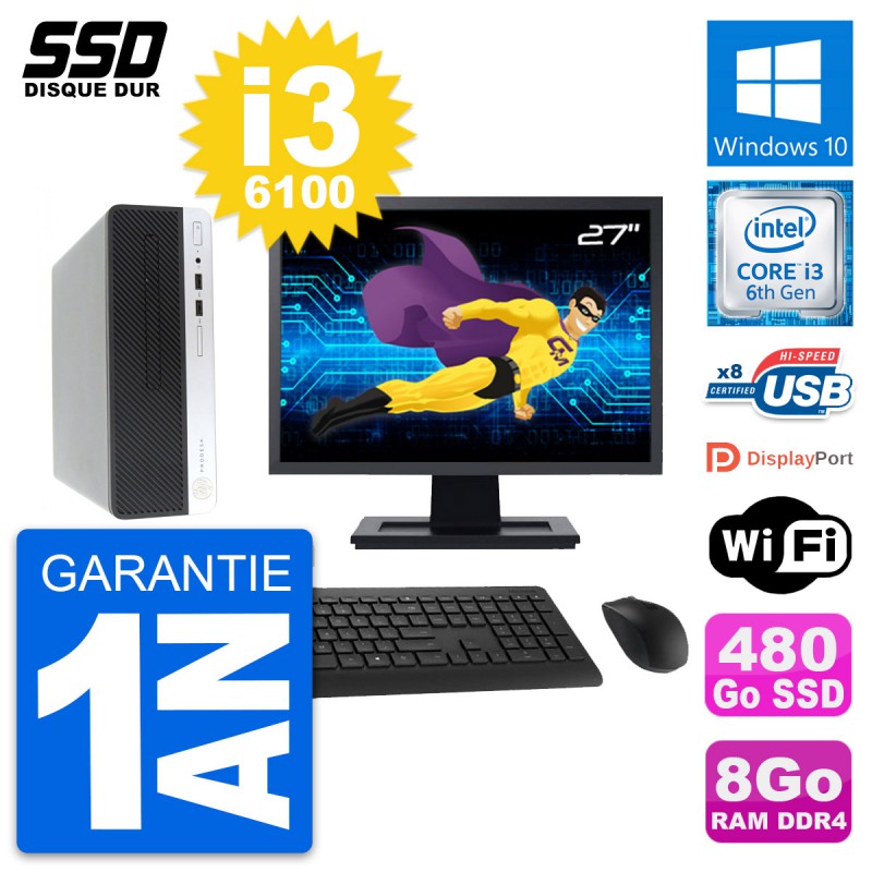 PC HP ProDesk 400 G4 SFF - Intel Core i3-6100 3.7 Ghz (3 Mo) - 8 Go DDR4 - SSD 480 Go - Clef Wifi USB - Windows 10 - Livré avec Ecran 27" + clavier + souris (Marques et modèles variables) - Garantie 1 an.