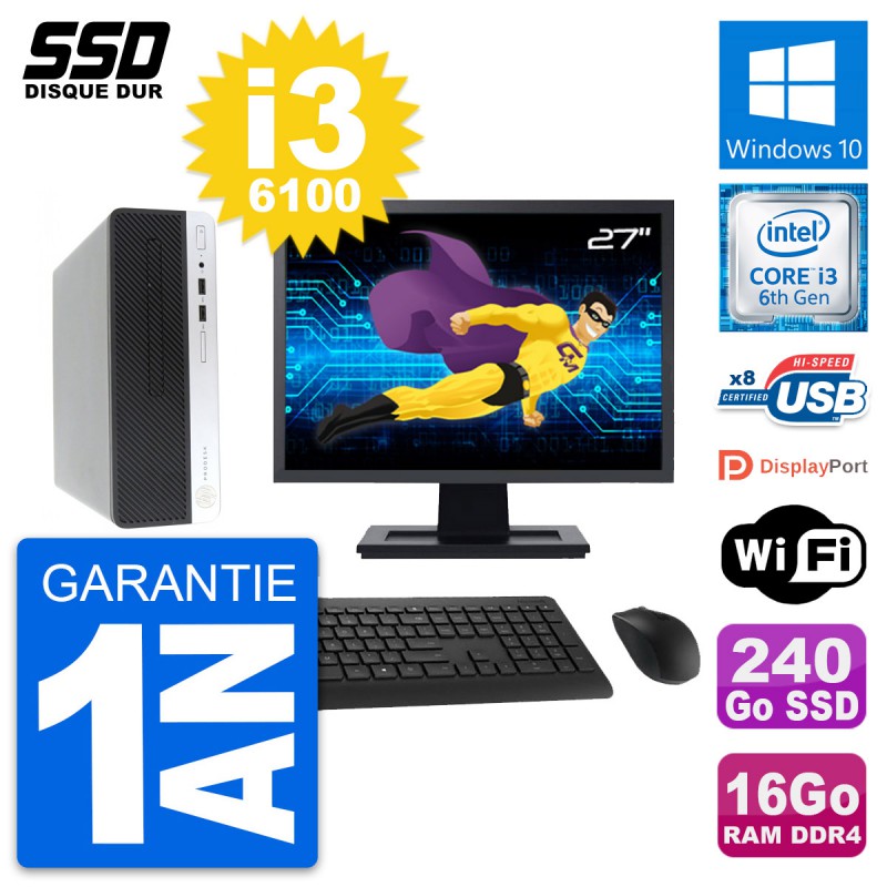 PC HP ProDesk 400 G4 SFF - Intel Core i3-6100 3.7 Ghz (3 Mo) - 16 Go DDR4 - SSD 240 Go - Clef Wifi USB - Windows 10 - Livré avec Ecran 27" + clavier + souris (Marques et modèles variables) - Garantie 1 an.