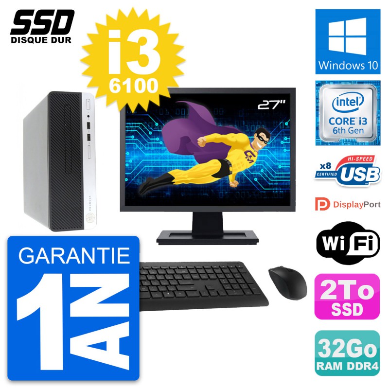 PC HP ProDesk 400 G4 SFF - Intel Core i3-6100 3.7 Ghz (3 Mo) - 32 Go DDR4 - SSD 2 To - Clef Wifi USB - Windows 10 - Livré avec Ecran 27" + clavier + souris (Marques et modèles variables) - Garantie 1 an.