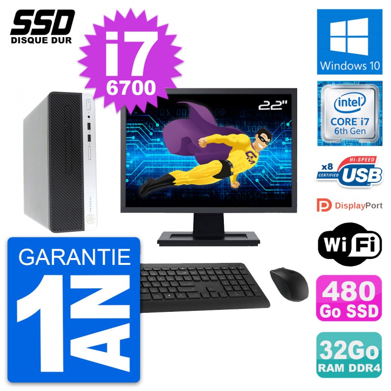 PC HP ProDesk 400 G4 SFF - Intel Core i7-6700 3.4 Ghz (8 Mo) - 32 Go DDR4 - SSD 480 Go - Clef Wifi USB - Windows 10 - Livré avec Ecran 22" + clavier + souris (Marques et modèles variables) - Garantie 1 an.
