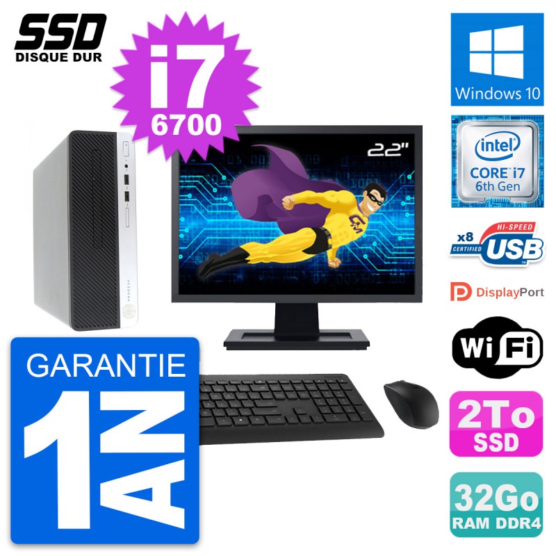 PC HP ProDesk 400 G4 SFF - Intel Core i7-6700 3.4 Ghz (8 Mo) - 32 Go DDR4 - SSD 2 To - Clef Wifi USB - Windows 10 - Livré avec Ecran 22" + clavier + souris (Marques et modèles variables) - Garantie 1 an.