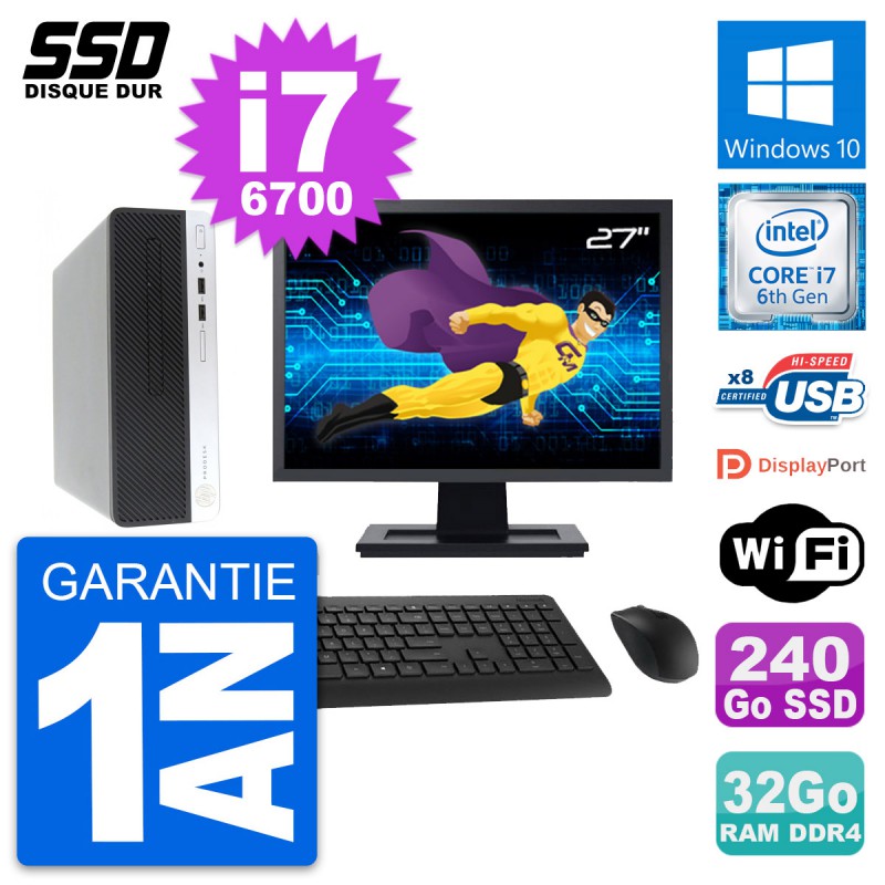 PC HP ProDesk 400 G4 SFF - Intel Core i7-6700 3.4 Ghz (8 Mo) - 32 Go DDR4 - SSD 240 Go - Clef Wifi USB - Windows 10 - Livré avec Ecran 27" + clavier + souris (Marques et modèles variables) - Garantie 1 an.