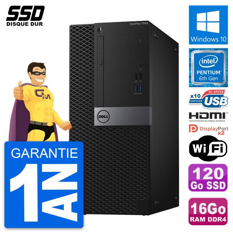 PC Tour Dell OptiPlex 7040 MT - Intel Pentium Dual-Core G4400 3.3 Ghz (3 Mo) - 16 Go DDR4 - SSD 120 Go - Clef Wifi USB - Graveur DVD - Windows 10 - Garantie 1 an.