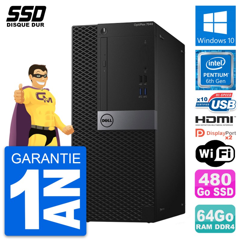 PC Tour Dell OptiPlex 7040 MT - Intel Pentium Dual-Core G4400 3.3 Ghz (3 Mo) - 64 Go DDR4 - SSD 480 Go - Clef Wifi USB - Graveur DVD - Windows 10 - Garantie 1 an.