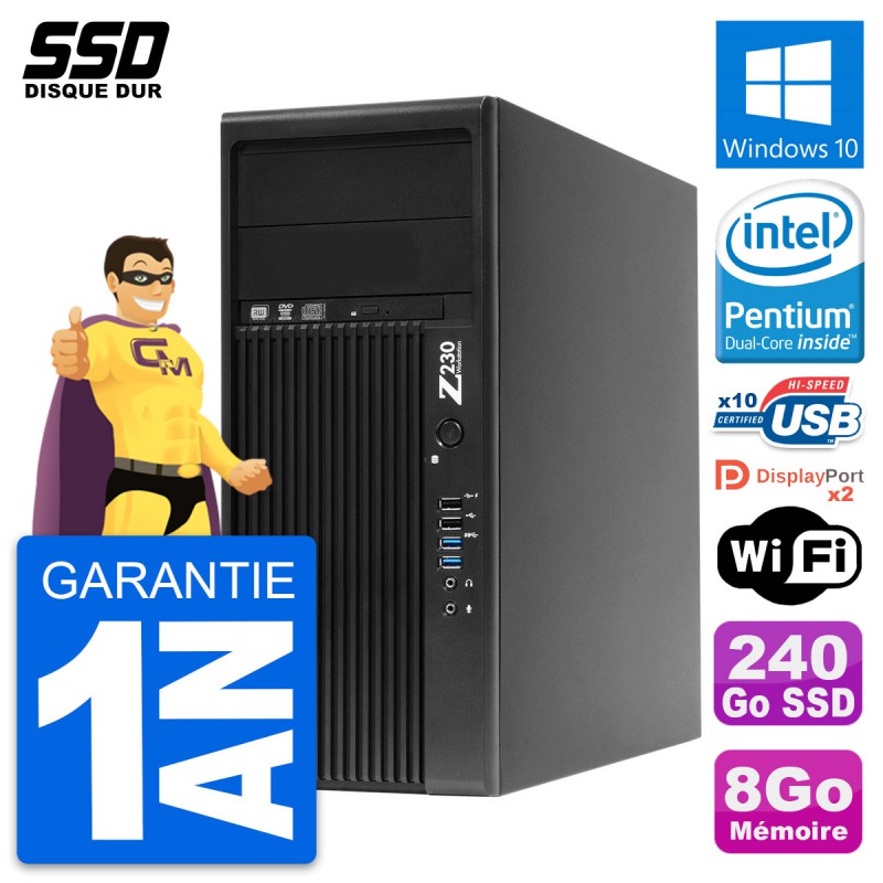 PC Tour HP WorkStation Z230 - Intel Pentium Dual-Core G3220 3.0 Ghz (3 Mo) - 8 Go DDR3 - SSD 240 Go - Graveur DVD - Clef Wifi USB - Windows 10 - Garantie 1 an.