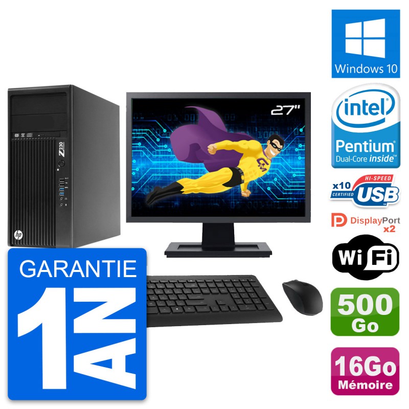 PC Tour HP WorkStation Z230 - Intel Pentium Dual-Core G3220 3.0 Ghz (3 Mo) - 16 Go DDR3 - Disque Dur 3,5" 500 Go - Graveur DVD - Clef Wifi USB - Windows 10 - Livré avec Ecran 27" + clavier + souris (Marques et modèles variables) - Garantie 1 an.