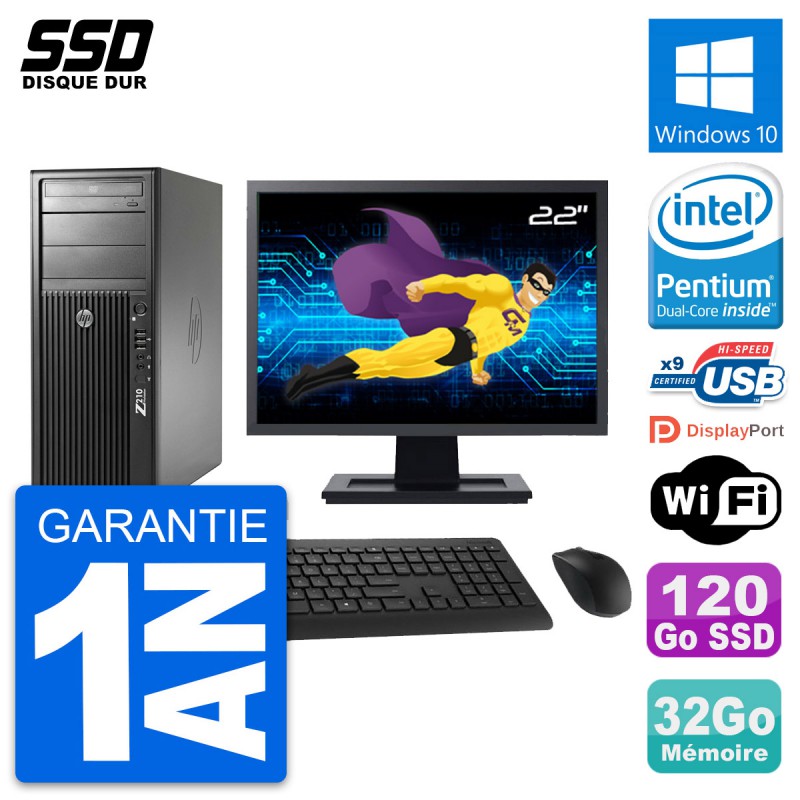 PC Tour HP WorkStation Z210 - Intel Pentium Dual-Core G630 2.7 Ghz (3 Mo) - 32 Go DDR3 - SSD 120 Go - Graveur DVD - Clef Wifi USB - Windows 10 - Livré avec Ecran 22" + clavier + souris (Marques et modèles variables) - Garantie 1 an.