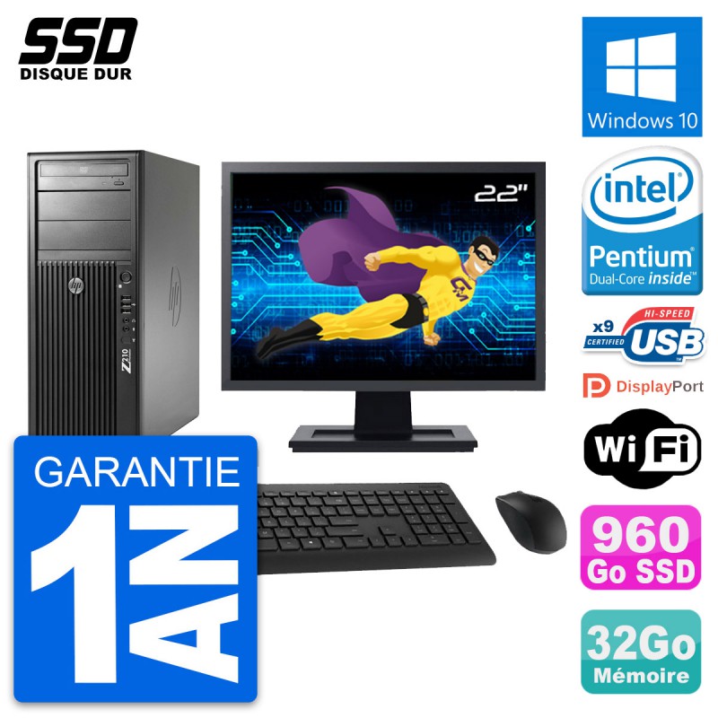 PC Tour HP Z210 Ecran 22" Intel Pentium G630 RAM 32Go SSD 960Go Windows 10 Wifi