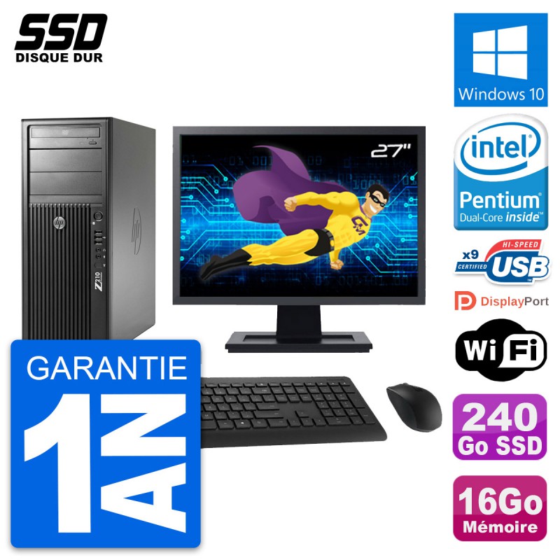 PC Tour HP WorkStation Z210 - Intel Pentium Dual-Core G630 2.7 Ghz (3 Mo) - 16 Go DDR3 - SSD 240 Go - Graveur DVD - Clef Wifi USB - Windows 10 - Livré avec Ecran 27" + clavier + souris (Marques et modèles variables) - Garantie 1 an.