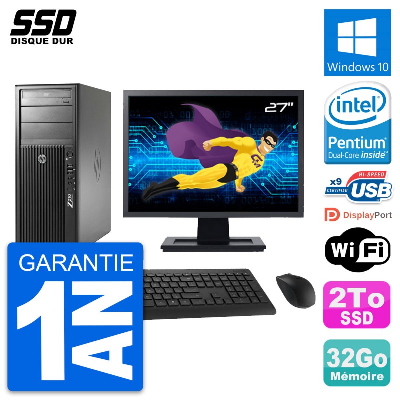 PC Tour HP WorkStation Z210 - Intel Pentium Dual-Core G630 2.7 Ghz (3 Mo) - 32 Go DDR3 - SSD 2 To - Graveur DVD - Clef Wifi USB - Windows 10 - Livré avec Ecran 27" + clavier + souris (Marques et modèles variables) - Garantie 1 an.