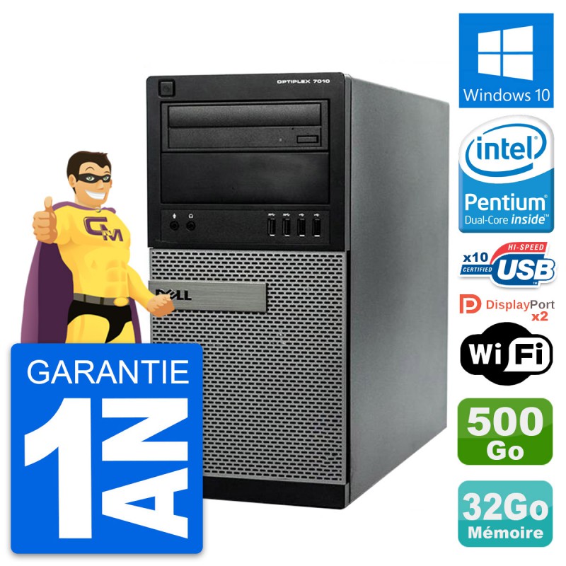 PC Dell Optiplex 7010 MT (Moyenne Tour) - Intel Pentium Dual-Core G2020 2.9 Ghz (3 Mo) - 32 Go DDR3 - Disque Dur 3,5" 500 Go - Graveur DVD - Clef Wifi USB - Windows 10 - Garantie 1 an.