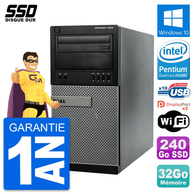 PC Dell Optiplex 7010 MT (Moyenne Tour) - Intel Pentium Dual-Core G2020 2.9 Ghz (3 Mo) - 32 Go DDR3 - SSD 240 Go - Graveur DVD - Clef Wifi USB - Windows 10 - Garantie 1 an.