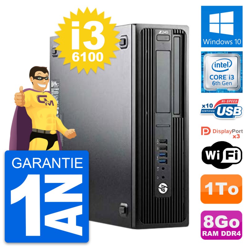 PC HP WorkStation Z240 SFF - Intel Core i3-6100 3.7 Ghz (3 Mo) - 8 Go DDR4 - Disque Dur 3,5" 1 To - Clef Wifi USB - Windows 10 - Garantie 1 an.