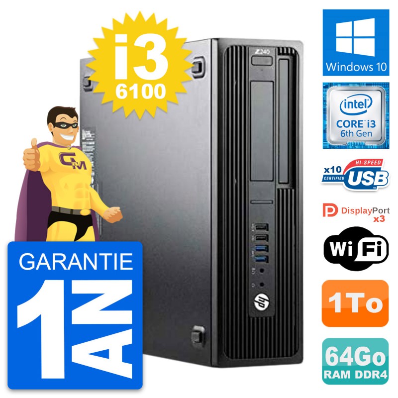 PC HP WorkStation Z240 SFF - Intel Core i3-6100 3.7 Ghz (3 Mo) - 64 Go DDR4 - Disque Dur 3,5" 1 To - Clef Wifi USB - Windows 10 - Garantie 1 an.