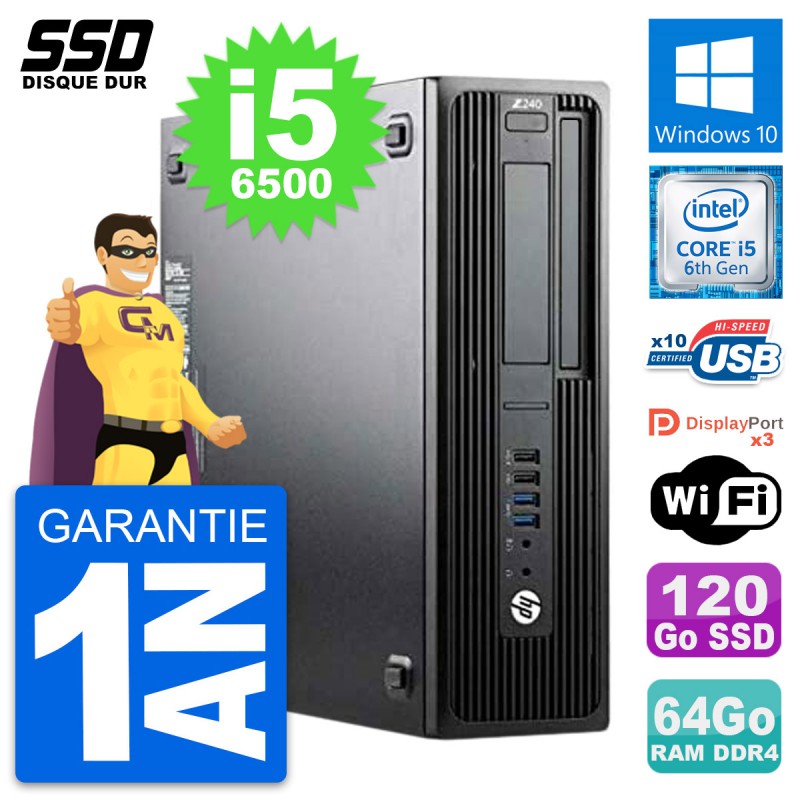 PC HP WorkStation Z240 SFF - Intel Core i5-6500 3.2 Ghz (6 Mo) - 64 Go DDR4 - SSD 120 Go - Clef Wifi USB - Windows 10 - Garantie 1 an.