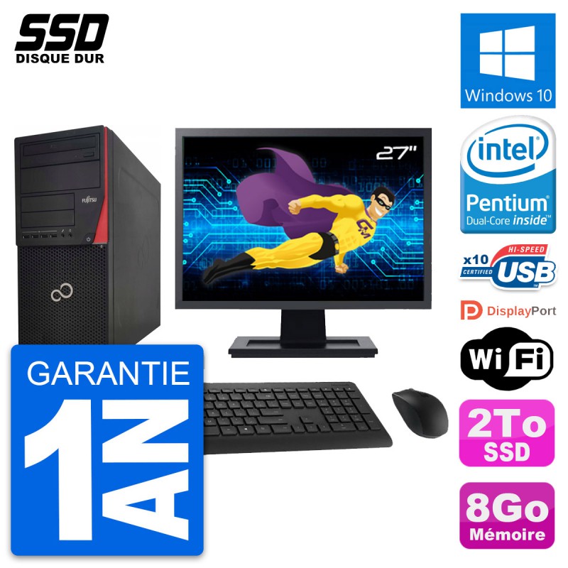 PC Tour Fujitsu Esprimo P920 - Intel Pentium Dual-Core G3220 3.0 Ghz (3 Mo) - 8 Go DDR3 - SSD 2 To - Graveur DVD - Clef Wifi USB - Windows 10 - Livré avec Ecran 27" + clavier + souris (Marques et modèles variables) - Garantie 1 an.