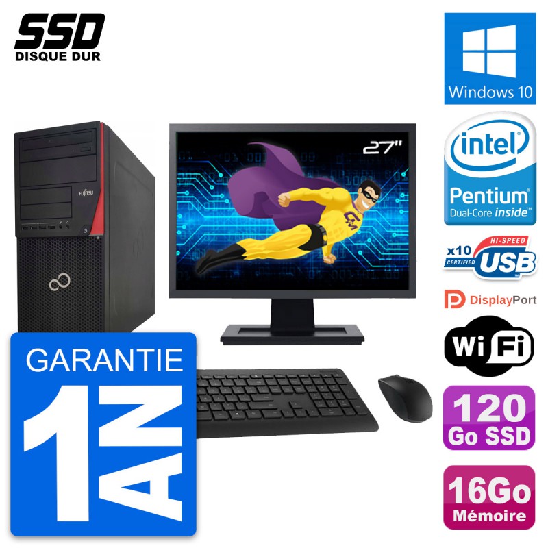 PC Tour Fujitsu Esprimo P920 - Intel Pentium Dual-Core G3220 3.0 Ghz (3 Mo) - 16 Go DDR3 - SSD 120 Go - Graveur DVD - Clef Wifi USB - Windows 10 - Livré avec Ecran 27" + clavier + souris (Marques et modèles variables) - Garantie 1 an.