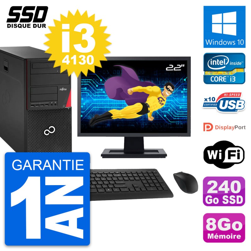 PC Tour Fujitsu Esprimo P920 - Intel Core i3-4130 3.4 Ghz (3 Mo) - 8 Go DDR3 - SSD 240 Go - Graveur DVD - Clef Wifi USB - Windows 10 - Livré avec Ecran 22" + clavier + souris (Marques et modèles variables) - Garantie 1 an.