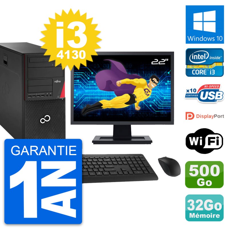 PC Tour Fujitsu Esprimo P920 - Intel Core i3-4130 3.4 Ghz (3 Mo) - 32 Go DDR3 - Disque Dur 3,5" 500 Go - Graveur DVD - Clef Wifi USB - Windows 10 - Livré avec Ecran 22" + clavier + souris (Marques et modèles variables) - Garantie 1 an.