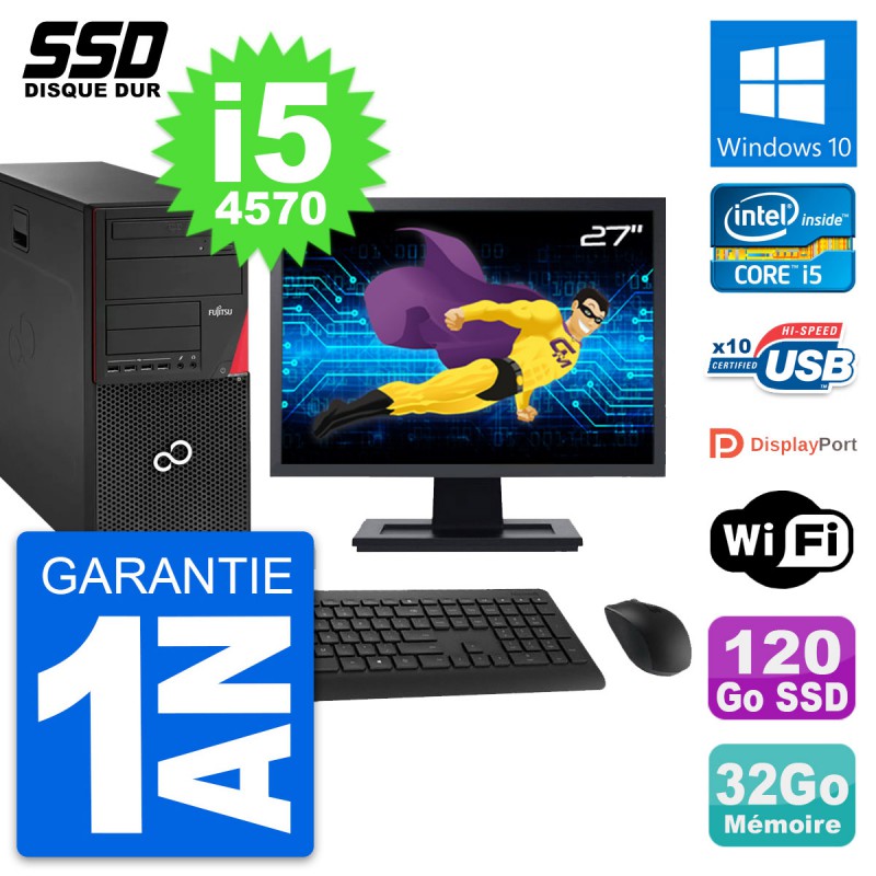 PC Tour Fujitsu Esprimo P920 - Intel Core i5-4570 3.2 Ghz (6 Mo) - 32 Go DDR3 - SSD 120 Go - Graveur DVD - Clef Wifi USB - Windows 10 - Livré avec Ecran 27" + clavier + souris (Marques et modèles variables) - Garantie 1 an.