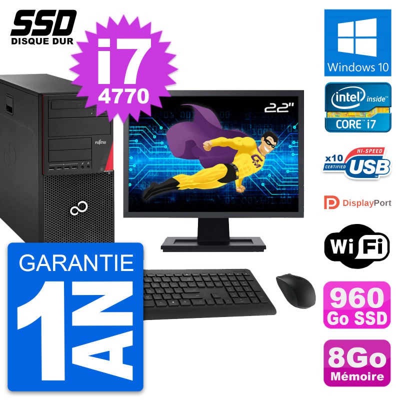 PC Tour Fujitsu Esprimo P920 - Intel Core i7-4770 3.4 Ghz (8 Mo) - 8 Go DDR3 - SSD 960 Go - Graveur DVD - Clef Wifi USB - Windows 10 - Livré avec Ecran 22" + clavier + souris (Marques et modèles variables) - Garantie 1 an.