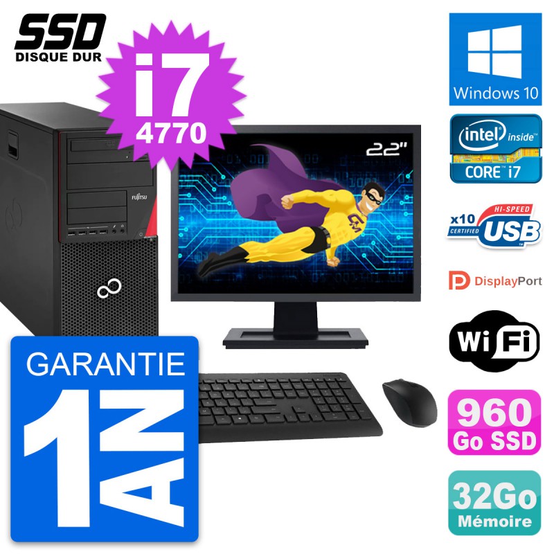 PC Tour Fujitsu Esprimo P920 - Intel Core i7-4770 3.4 Ghz (8 Mo) - 32 Go DDR3 - SSD 960 Go - Graveur DVD - Clef Wifi USB - Windows 10 - Livré avec Ecran 22" + clavier + souris (Marques et modèles variables) - Garantie 1 an.