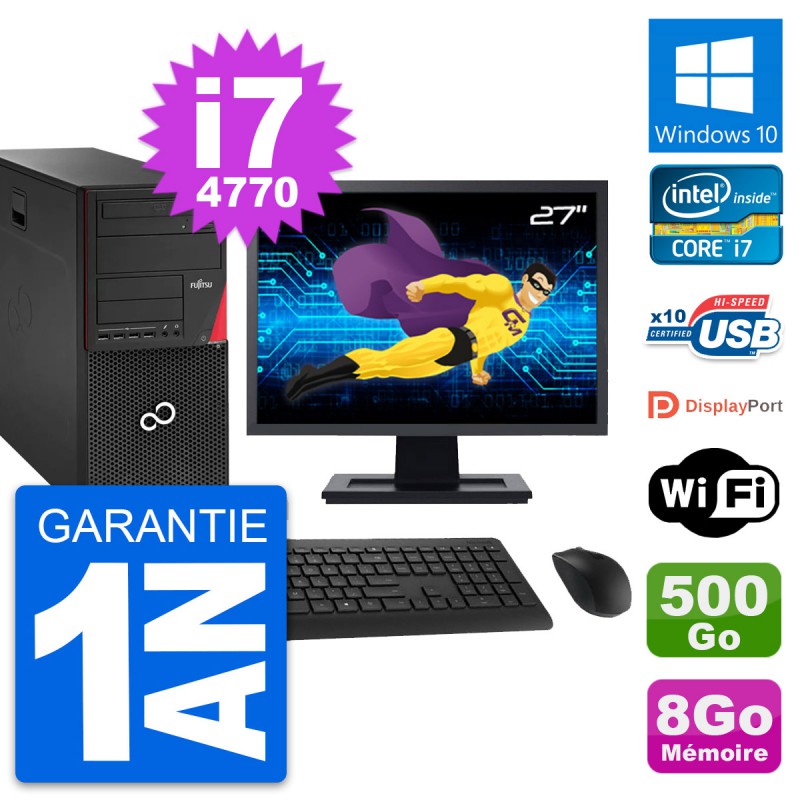 PC Tour Fujitsu Esprimo P920 - Intel Core i7-4770 3.4 Ghz (8 Mo) - 8 Go DDR3 - Disque Dur 3,5" 500 Go - Graveur DVD - Clef Wifi USB - Windows 10 - Livré avec Ecran 27" + clavier + souris (Marques et modèles variables) - Garantie 1 an.