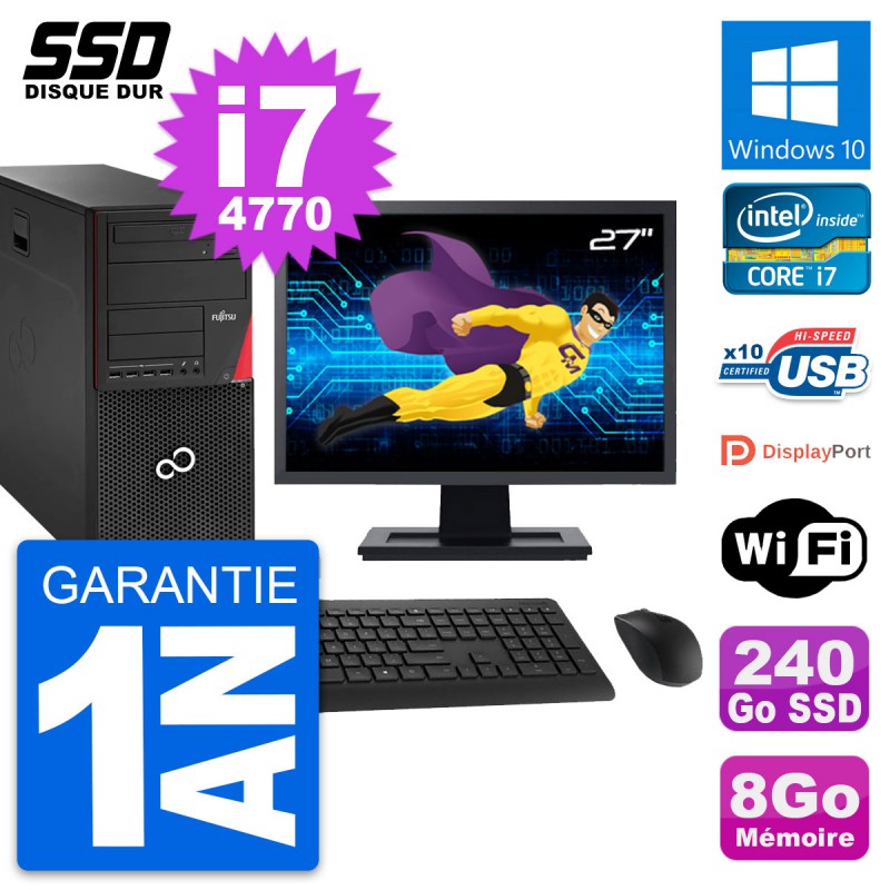 PC Tour Fujitsu Esprimo P920 - Intel Core i7-4770 3.4 Ghz (8 Mo) - 8 Go DDR3 - SSD 240 Go - Graveur DVD - Clef Wifi USB - Windows 10 - Livré avec Ecran 27" + clavier + souris (Marques et modèles variables) - Garantie 1 an.