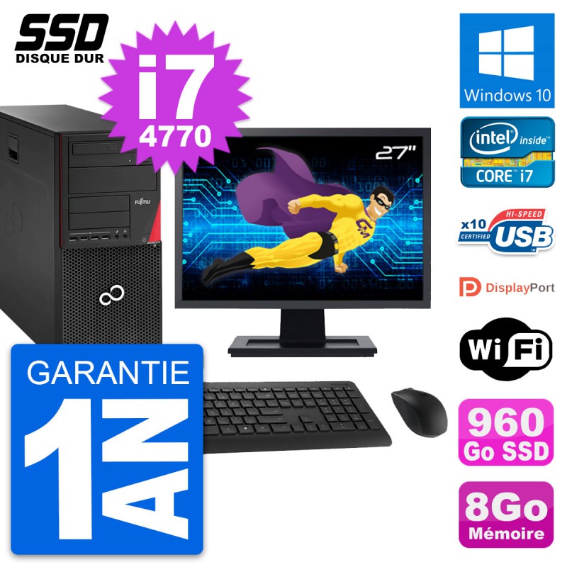 PC Tour Fujitsu Esprimo P920 - Intel Core i7-4770 3.4 Ghz (8 Mo) - 8 Go DDR3 - SSD 960 Go - Graveur DVD - Clef Wifi USB - Windows 10 - Livré avec Ecran 27" + clavier + souris (Marques et modèles variables) - Garantie 1 an.