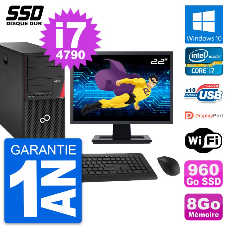 PC Tour Fujitsu Esprimo P920 - Intel Core i7-4790 3.6 Ghz (8 Mo) - 8 Go DDR3 - SSD 960 Go - Graveur DVD - Clef Wifi USB - Windows 10 - Livré avec Ecran 22" + clavier + souris (Marques et modèles variables) - Garantie 1 an.