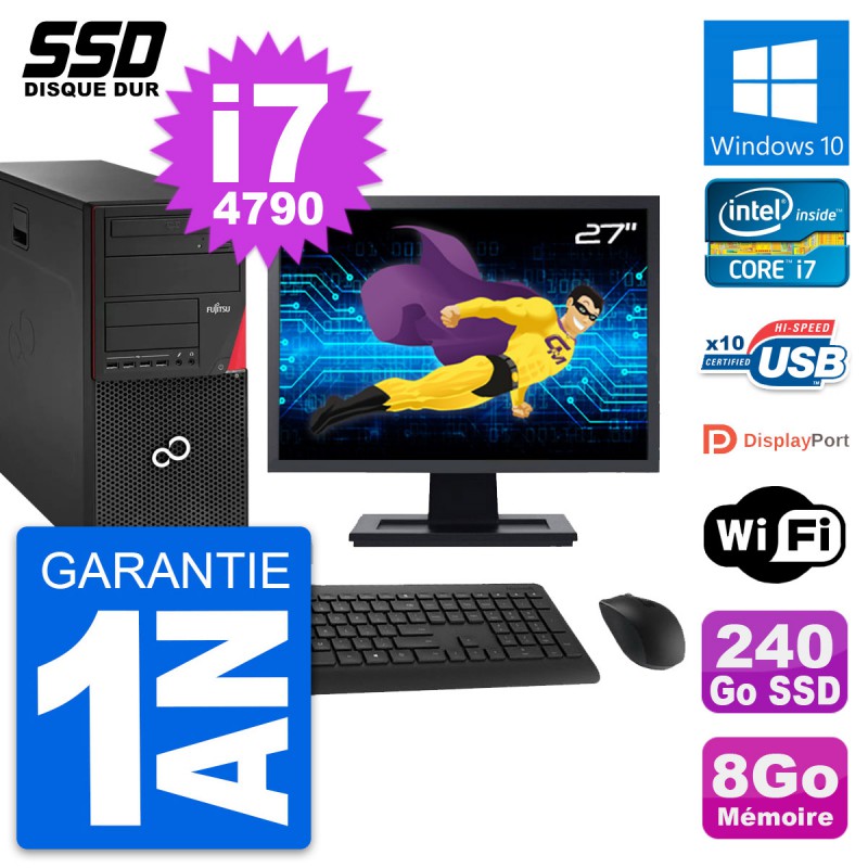 PC Tour Fujitsu Esprimo P920 - Intel Core i7-4790 3.6 Ghz (8 Mo) - 8 Go DDR3 - SSD 240 Go - Graveur DVD - Clef Wifi USB - Windows 10 - Livré avec Ecran 27" + clavier + souris (Marques et modèles variables) - Garantie 1 an.