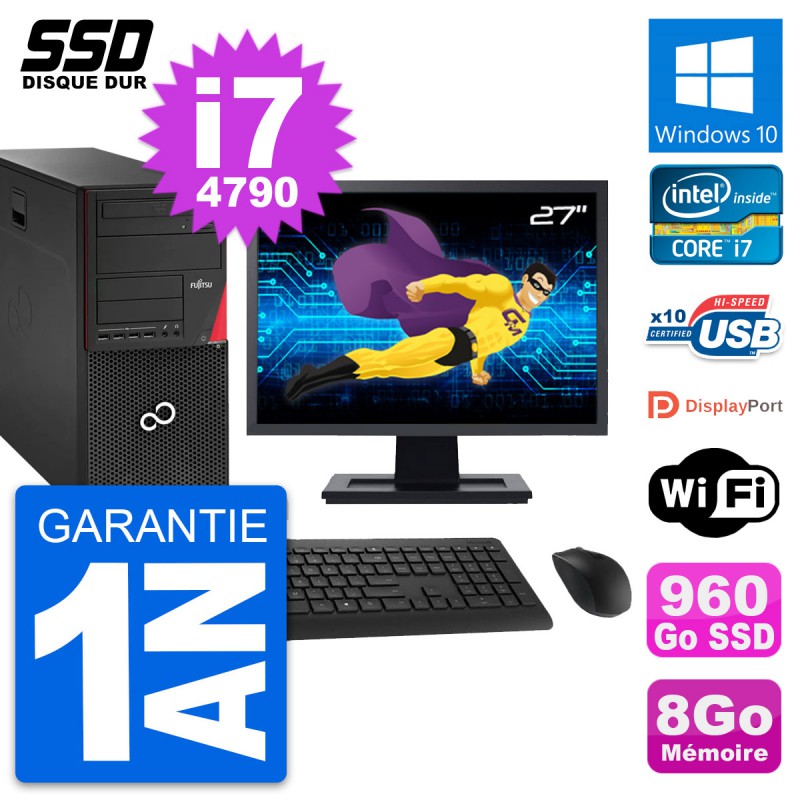 PC Tour Fujitsu Esprimo P920 - Intel Core i7-4790 3.6 Ghz (8 Mo) - 8 Go DDR3 - SSD 960 Go - Graveur DVD - Clef Wifi USB - Windows 10 - Livré avec Ecran 27" + clavier + souris (Marques et modèles variables) - Garantie 1 an.