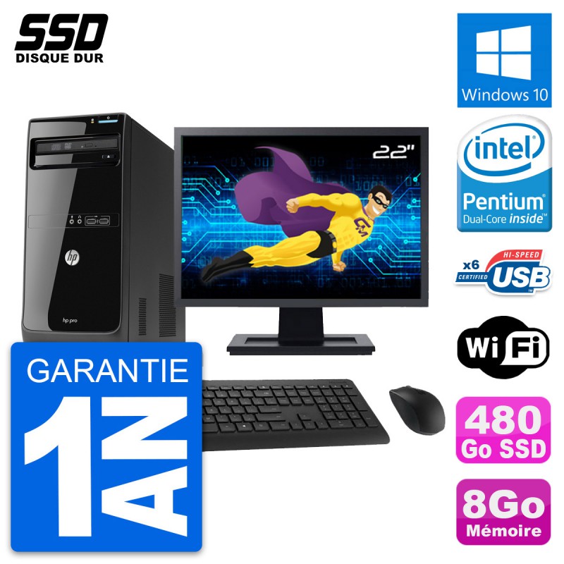 PC Tour HP Pro 3400 MT - Intel Pentium Dual-Core G630 2.7 Ghz (3 Mo) - 8 Go DDR3 - Disque Dur SSD 480 Go - Graveur DVD - Clef Wifi USB - Windows 10 - Livré avec Ecran 22" + clavier + souris (Marques et modèles variables) - Garantie 1 an.