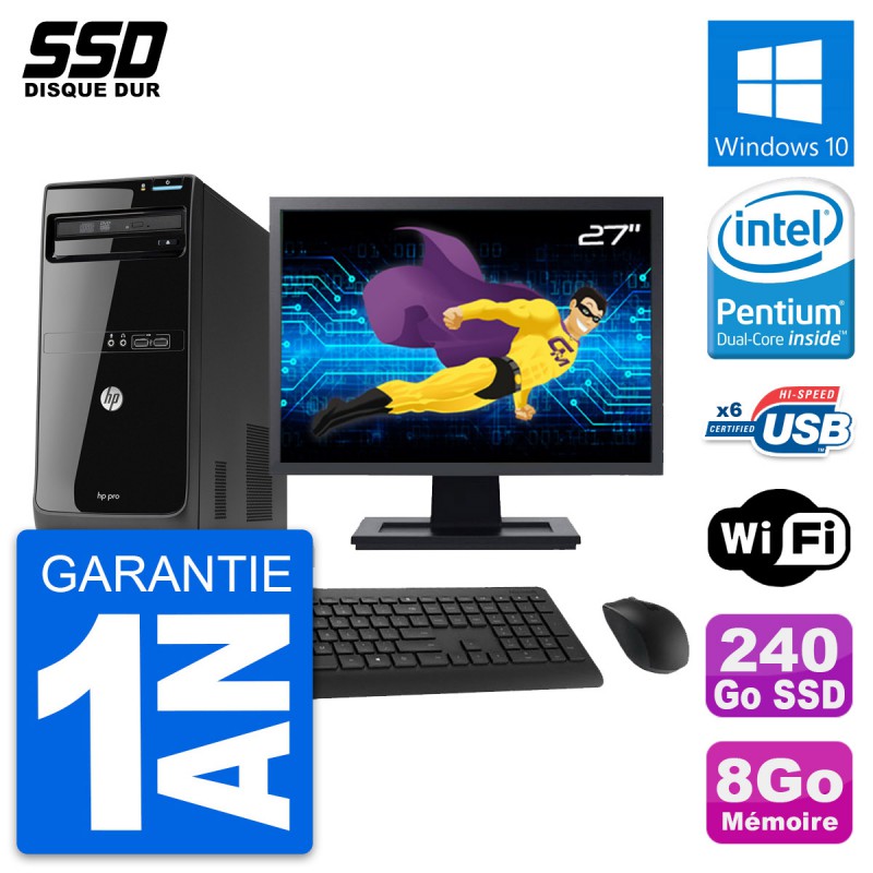 PC Tour HP Pro 3400 MT - Intel Pentium Dual-Core G630 2.7 Ghz (3 Mo) - 8 Go DDR3 - Disque Dur SSD 240 Go - Graveur DVD - Clef Wifi USB - Windows 10 - Livré avec Ecran 27" + clavier + souris (Marques et modèles variables) - Garantie 1 an.