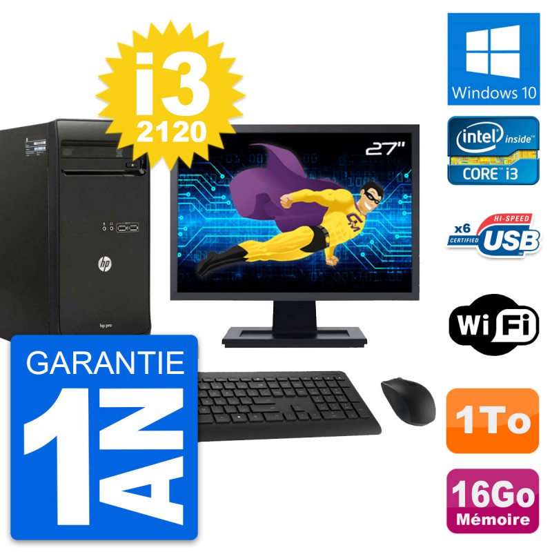 PC Tour HP Pro 3400 MT Ecran 27" i3-2120 RAM 16Go Disque 1To Windows 10 Wifi