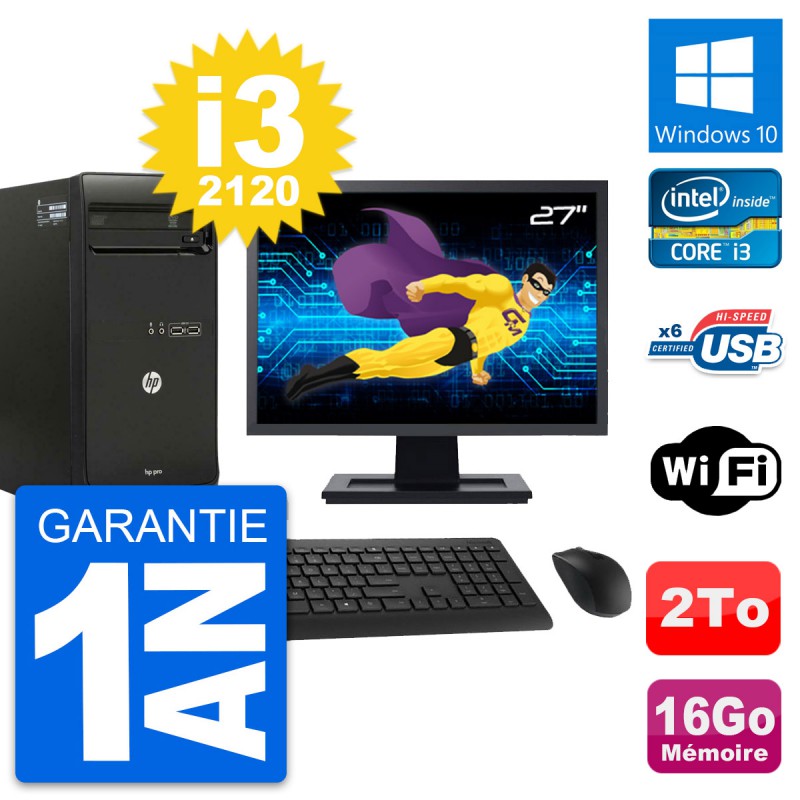 PC Tour HP Pro 3400 MT Ecran 27" i3-2120 RAM 16Go Disque 2To Windows 10 Wifi