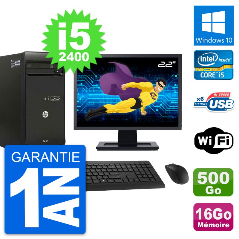 PC Tour HP Pro 3400 MT Ecran 22" i5-2400 RAM 16Go Disque 500Go Windows 10 Wifi