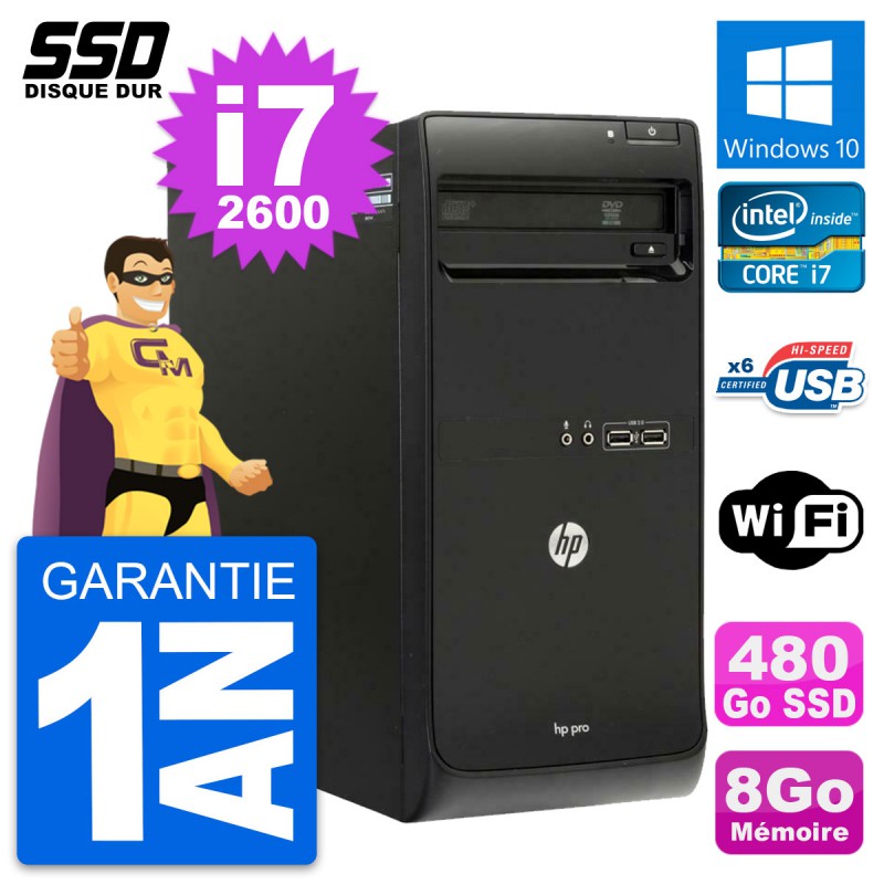 PC Tour HP Pro 3400 MT - Intel Core i7-2600 3.4 Ghz (8 Mo) - 8 Go DDR3 - Disque Dur SSD 480 Go - Graveur DVD - Clef Wifi USB - Windows 10 - Garantie 1 an.
