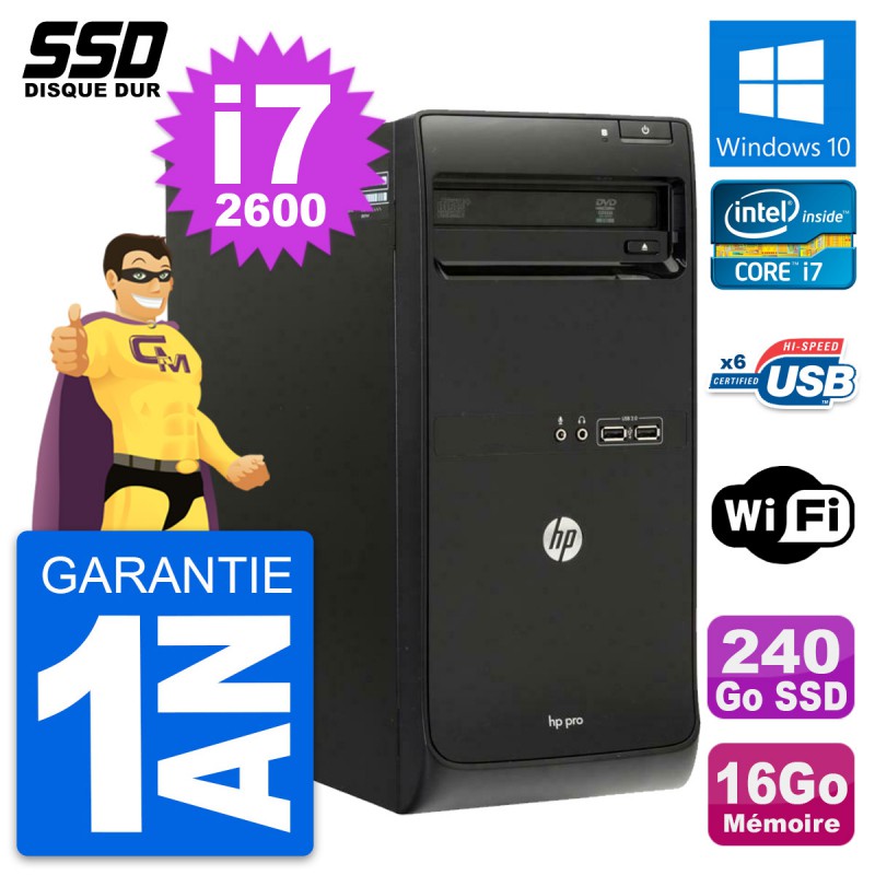 PC Tour HP Pro 3400 MT - Intel Core i7-2600 3.4 Ghz (8 Mo) - 16 Go DDR3 - Disque Dur SSD 240 Go - Graveur DVD - Clef Wifi USB - Windows 10 - Garantie 1 an.