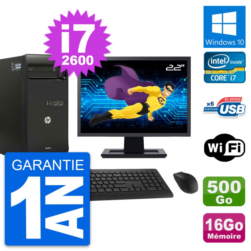 PC Tour HP Pro 3400 MT Ecran 22" i7-2600 RAM 16Go Disque 500Go Windows 10 Wifi