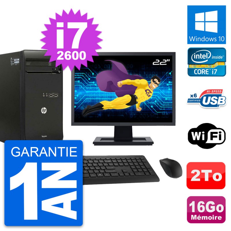 PC Tour HP Pro 3400 MT Ecran 22" i7-2600 RAM 16Go Disque 2To Windows 10 Wifi