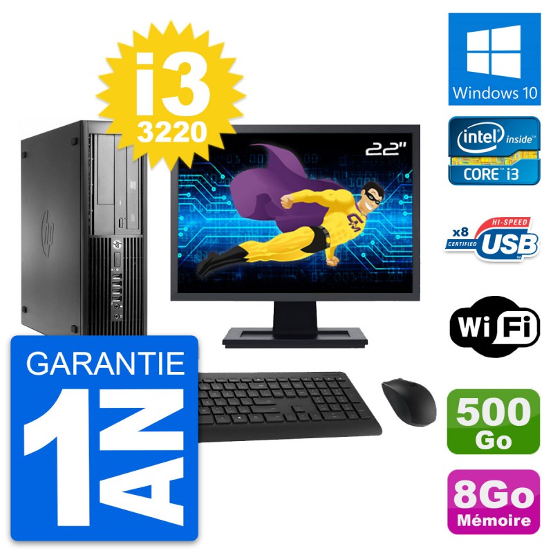 PC HP Compaq Pro 4300 SFF - Intel Core i3-3220 3.3 Ghz (3 Mo) - 8 Go DDR3 - Disque Dur 3,5" 500 Go - Graveur DVD - Clef Wifi USB - Windows 10 - Livré avec Ecran 22" + clavier + souris (Marques et modèles variables) - Garantie 1 an.