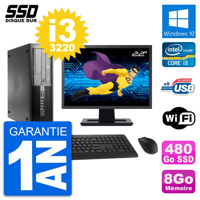 PC HP Compaq Pro 4300 SFF - Intel Core i3-3220 3.3 Ghz (3 Mo) - 8 Go DDR3 - Disque Dur SSD 480 Go - Graveur DVD - Clef Wifi USB - Windows 10 - Livré avec Ecran 22" + clavier + souris (Marques et modèles variables) - Garantie 1 an.