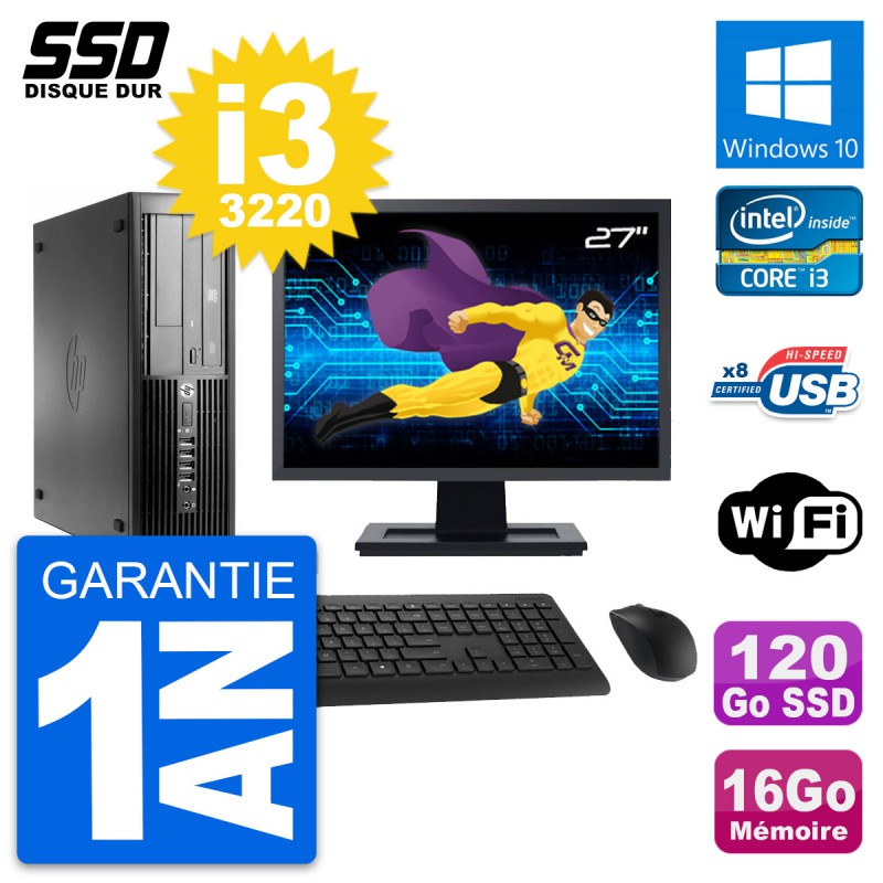 PC HP Compaq Pro 4300 SFF - Intel Core i3-3220 3.3 Ghz (3 Mo) - 16 Go DDR3 - Disque Dur SSD 120 Go - Graveur DVD - Clef Wifi USB - Windows 10 - Livré avec Ecran 27" + clavier + souris (Marques et modèles variables) - Garantie 1 an.