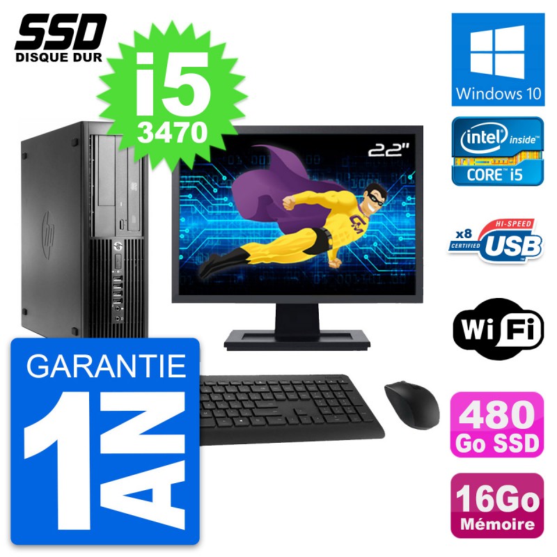 PC HP Compaq Pro 4300 SFF - Intel Core i5-3470 3.2 Ghz (6 Mo) - 16 Go DDR3 - Disque Dur SSD 480 Go - Graveur DVD - Clef Wifi USB - Windows 10 - Livré avec Ecran 22" + clavier + souris (Marques et modèles variables) - Garantie 1 an.