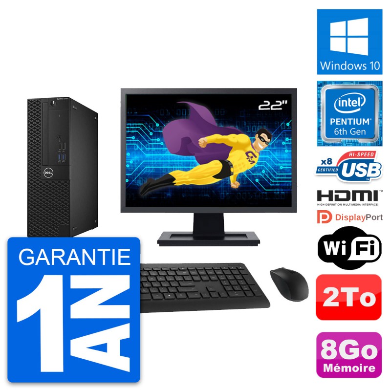 PC Dell OptiPlex 3050 SFF - Intel Pentium Dual-Core G4400 3.3 Ghz (3 Mo) - 8 Go DDR4 - Disque Dur 3,5" 2 To - Clef Wifi USB - Windows 10 - Livré avec Ecran 22" + clavier + souris (Marques et modèles variables) - Garantie 1 an.
