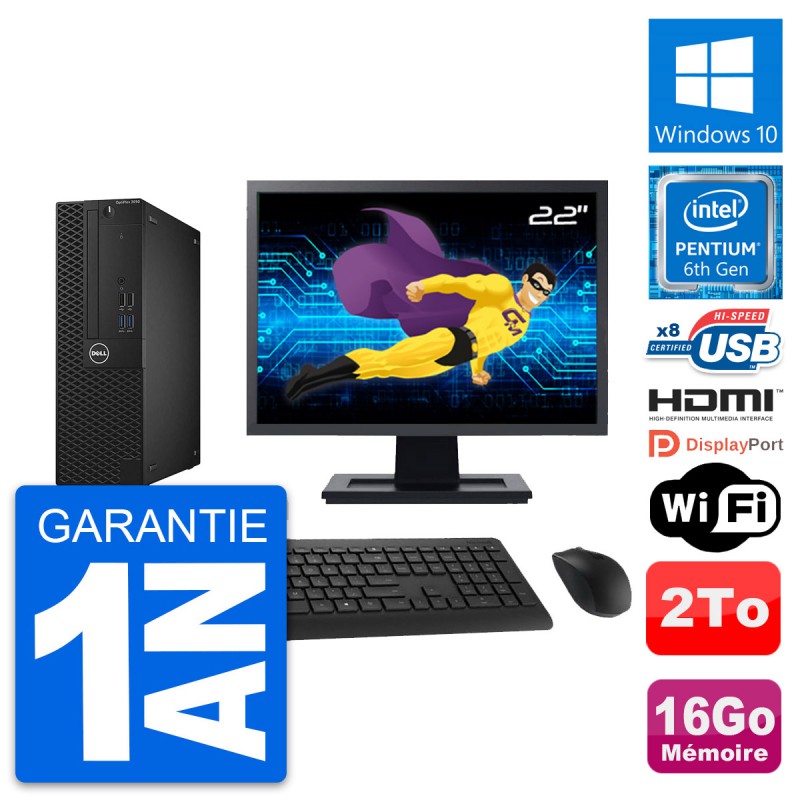 PC Dell OptiPlex 3050 SFF - Intel Pentium Dual-Core G4400 3.3 Ghz (3 Mo) - 16 Go DDR4 - Disque Dur 3,5" 2 To - Clef Wifi USB - Windows 10 - Livré avec Ecran 22" + clavier + souris (Marques et modèles variables) - Garantie 1 an.