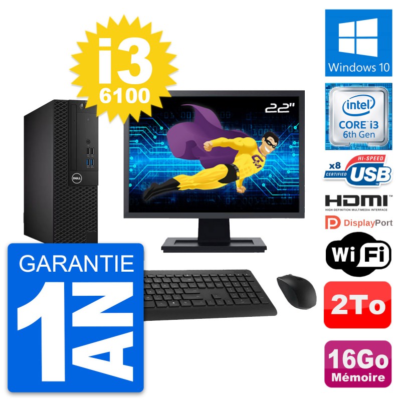 PC Dell 3050 SFF Ecran 22" Core i3-6100 RAM 16Go Disque 2To HDMI Windows 10 Wifi