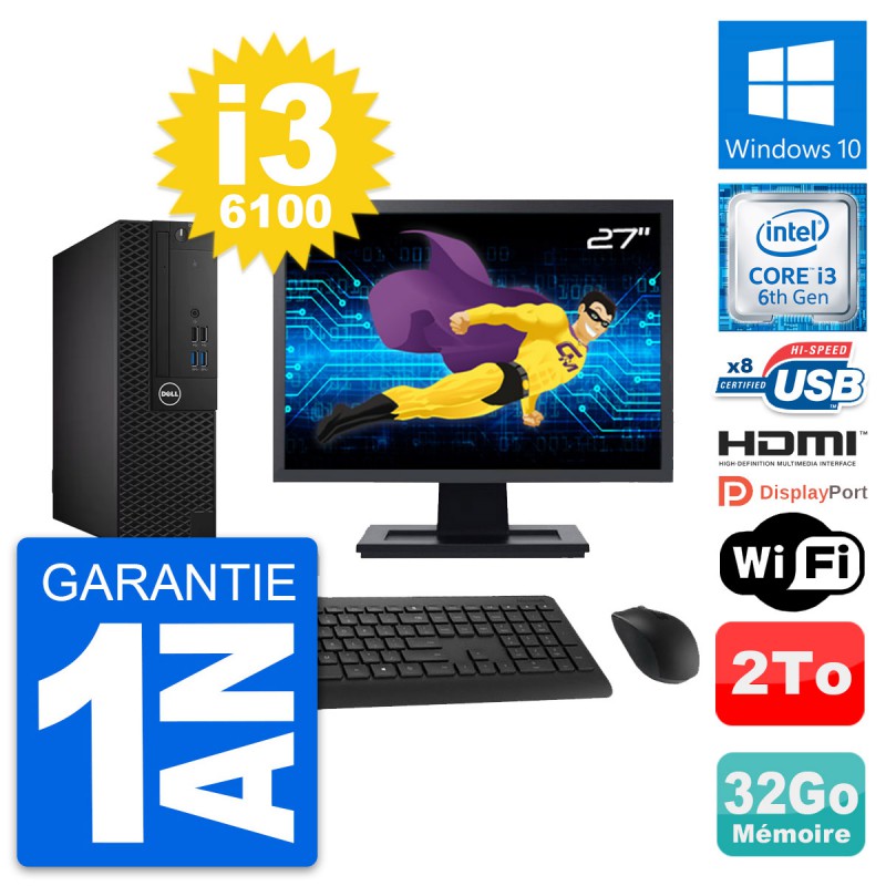 PC Dell OptiPlex 3050 SFF - Intel Core i3-6100 3.7 Ghz (3 Mo) - 32 Go DDR4 - Disque Dur 3,5" 2 To - Clef Wifi USB - Windows 10 - Livré avec Ecran 27" + clavier + souris (Marques et modèles variables) - Garantie 1 an.
