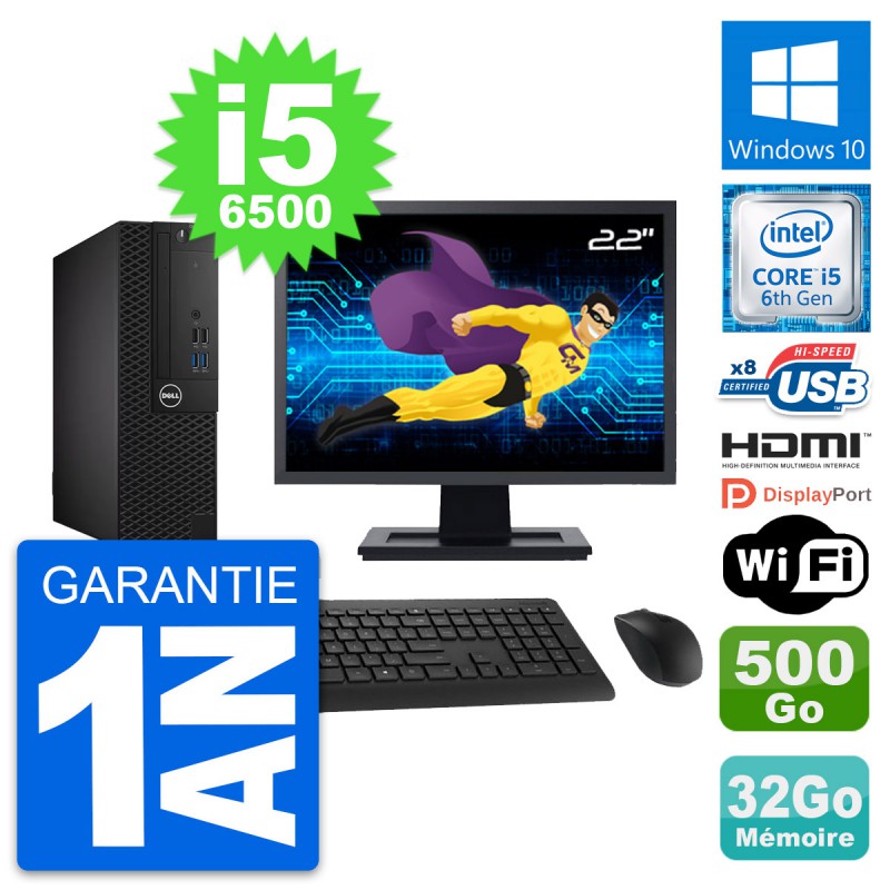 PC Dell OptiPlex 3050 SFF - Intel Core i5-6500 3.2 Ghz (6 Mo) - 32 Go DDR4 - Disque Dur 3,5" 500 Go - Clef Wifi USB - Windows 10 - Livré avec Ecran 22" + clavier + souris (Marques et modèles variables) - Garantie 1 an.